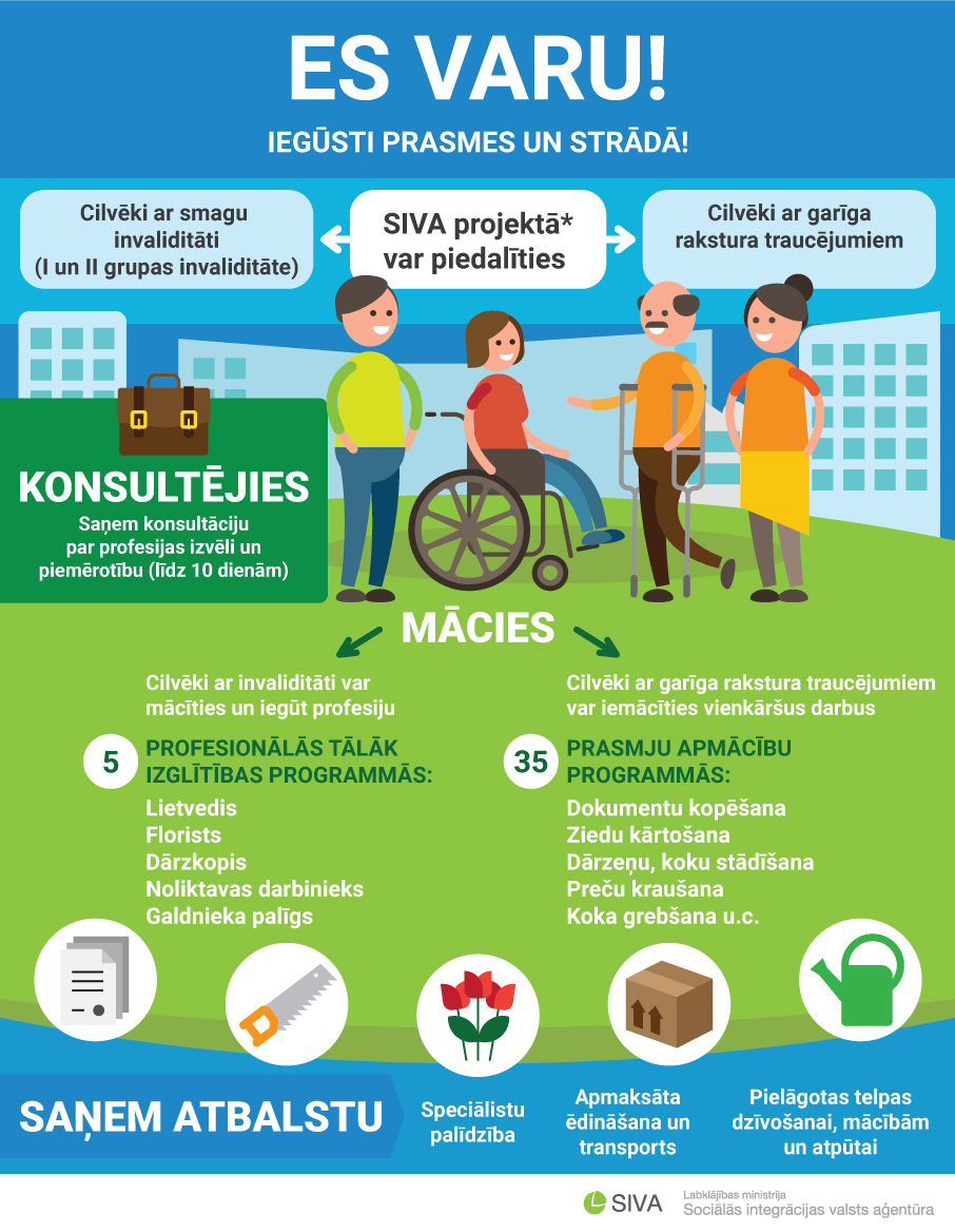 To promote the integration of people with severe disabilities and mental health disorders (MHDs) into the labour market, the Social Integration State Agency’s (SISA) project “Employment and Social Integration of People with Disabilities or Mental Health Disorders” includes five professional continuing education programmes and 35 skill training programmes.